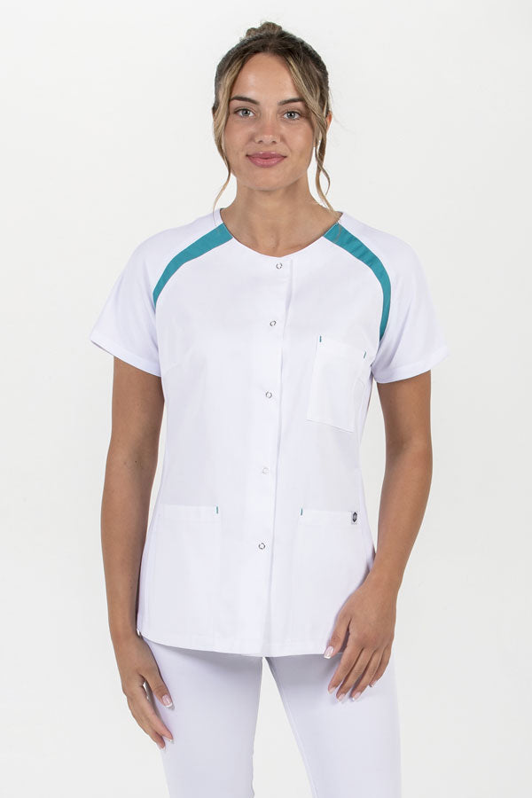 Túnica raglán de manga corta para mujer. Cuello redondo. Tejido sarga con malla transpirable en mangas y canalé, contraste en mangas y costuras de refuerzo en bolsillo. Se fija con ganchos. Tiene dos bolsillos inferiores y un bolsillo en el pecho.Longitud: 63 cm.