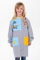 Manteau enfant à manches longues avec col rond et poignets élastiques. Tissu en polyester imprimé de différentes couleurs avec des imprimés de monstres amusants sur les deux poches. Manches de différentes couleurs contrastées. Se ferme avec des boutons. Ruban intérieur au cou pour accrocher.