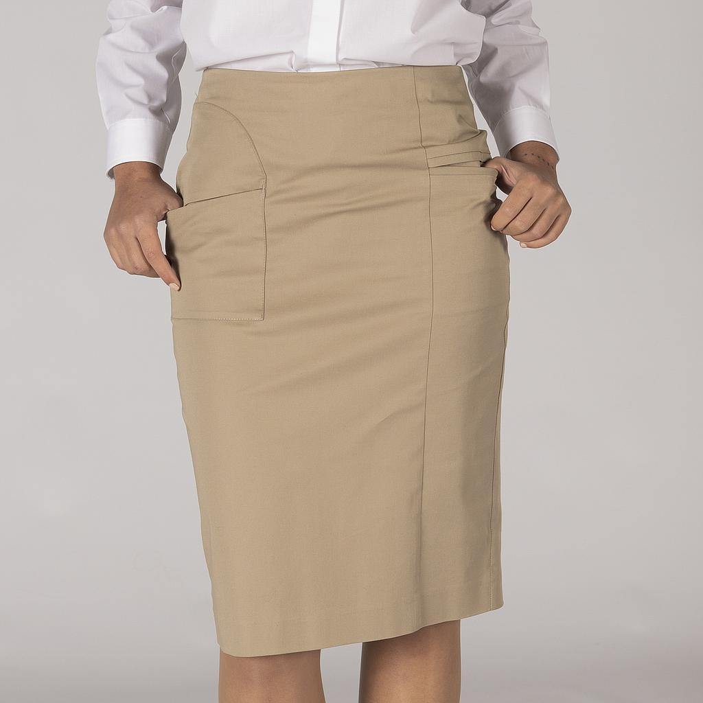 Jupe ajustée sans ceinture, en tissu élastique FROID. Modèle avec deux poches avant, fermées par une fermeture éclair au dos. De plus, il a une ouverture arrière, offrant un plus grand confort. Idéal comme uniforme de serveuse, de réception, de transport, de bureau ou de commerce.