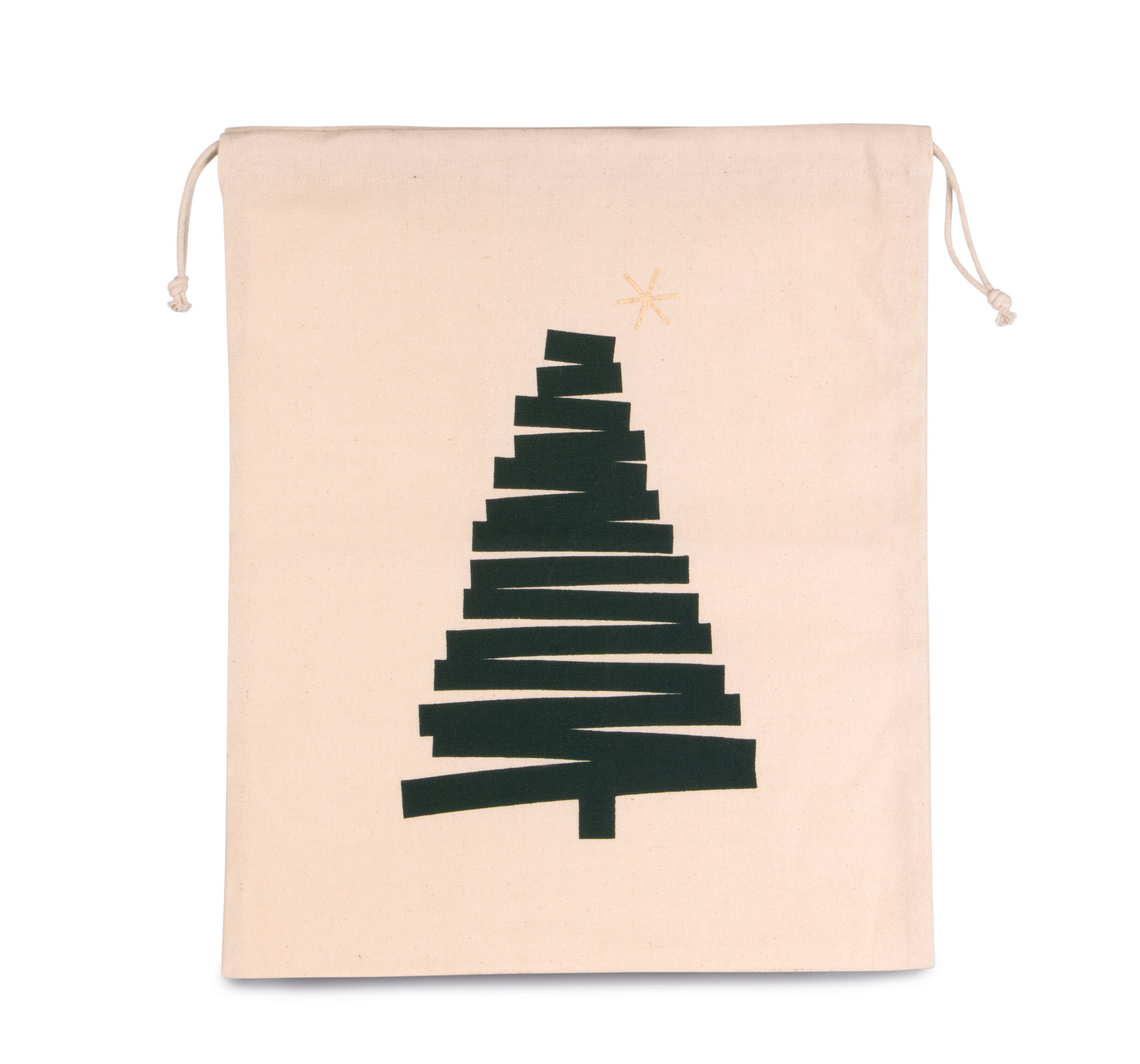 220 g/m². 100% Coton. Sac à cordon, motif sapin de Noël. 38 x 45 cm.