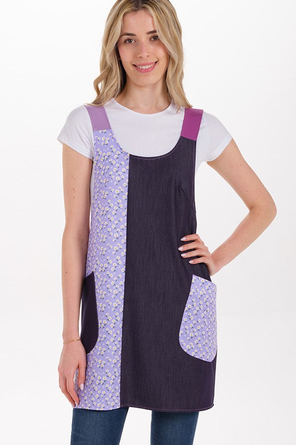 Tablier pour enseignants et commerce réalisé en tissus élastiques fins de style denim combinés à un tissu floral dans les tons de rose. Anses fuchsia et pistache. Deux grandes poches. Il n'a pas de rubans et est placé au dos.