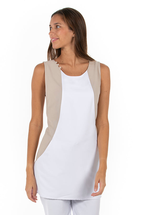 Tablier pour le commerce et l'esthétique en microfibre. Détail de lanières en satin noir sur le côté du cou. Conception d'effet ajusté. S'ajuste avec des rubans à l'arrière. Deux poches inférieures cachées sur les côtés. Taille unique. Longueur : 78 cm. Tissu léger, sèche rapidement et se repasse facilement.