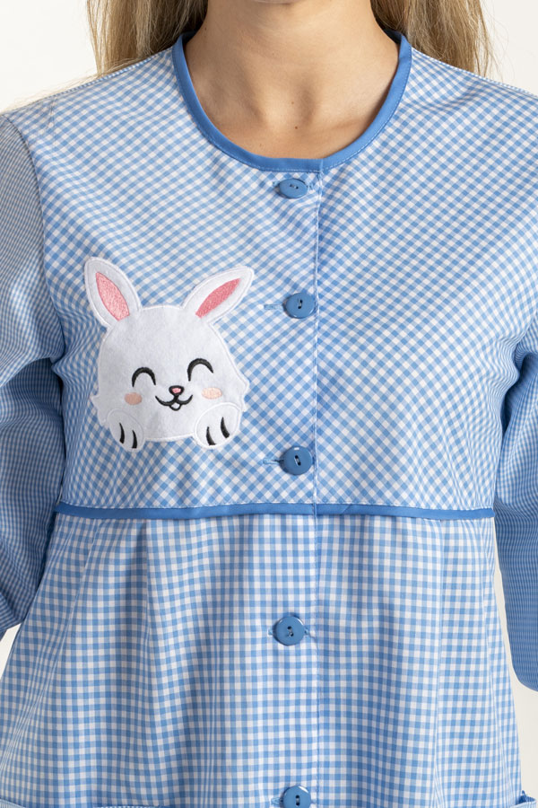 Manteau pour éducateur de la petite enfance. Encolure ronde et manches longues avec poignets élastiques. Fabriqué en carrés bleus, il présente un bleu vif contrasté sur les poches, le col et la ligne de poitrine . Il présente une broderie amusante en forme de lapin sur la poitrine et une broderie carotte sur l'une des poches. Deux poches basses. Bouton coincé. Longueur : 89 cm Ouvertures latérales inférieures Taille : SP-PMG-SG-SSG-XL