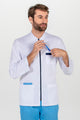 Túnica feminina para farmácia e clínicas. Manga curta, peça justa cruzada presa com ilhoses. Debrum duplo com tons na gola e mangas cruzadas, possui ombreiras.