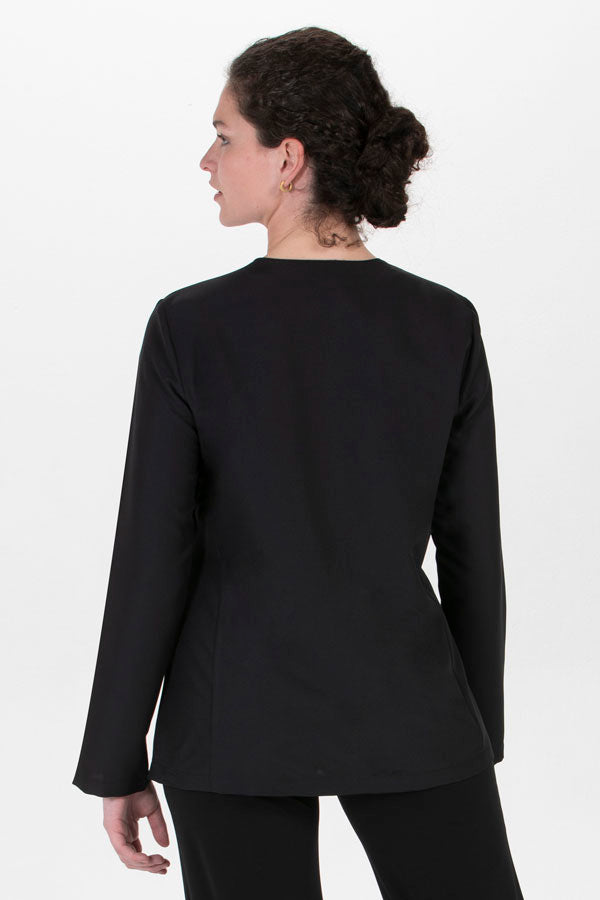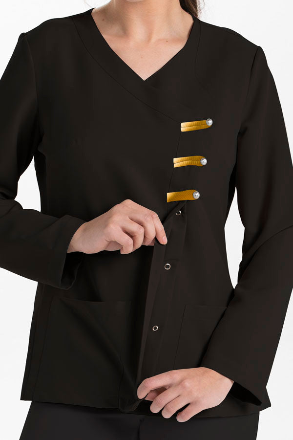 Tunica in microfibra per il commercio e la salute. Manica lunga. Dettaglio passanti e bottoni in raso. Si chiude in diagonale...
