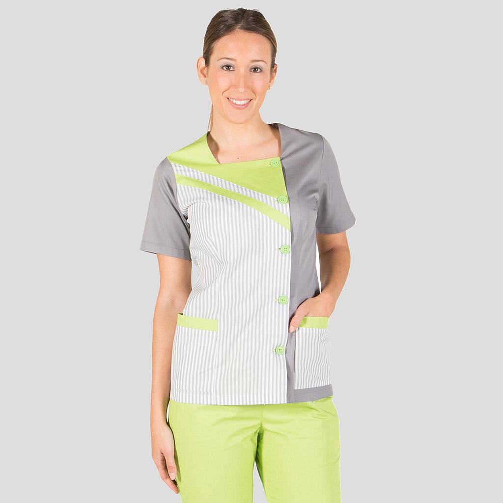 Bata curta feminino de manga curta, com decote quadrado, fechadura lateral com botões de losango e dois bolsos entre as costuras. Peça semi-justa, com pinças na frente e nas costas e cinto nas costas. Feito de tecido ás riscas cinza, combinado em cinza liso e lilás ou pistache no pescoço e boca dos bolsos. Ideal para limpeza ou uniforme comercial.