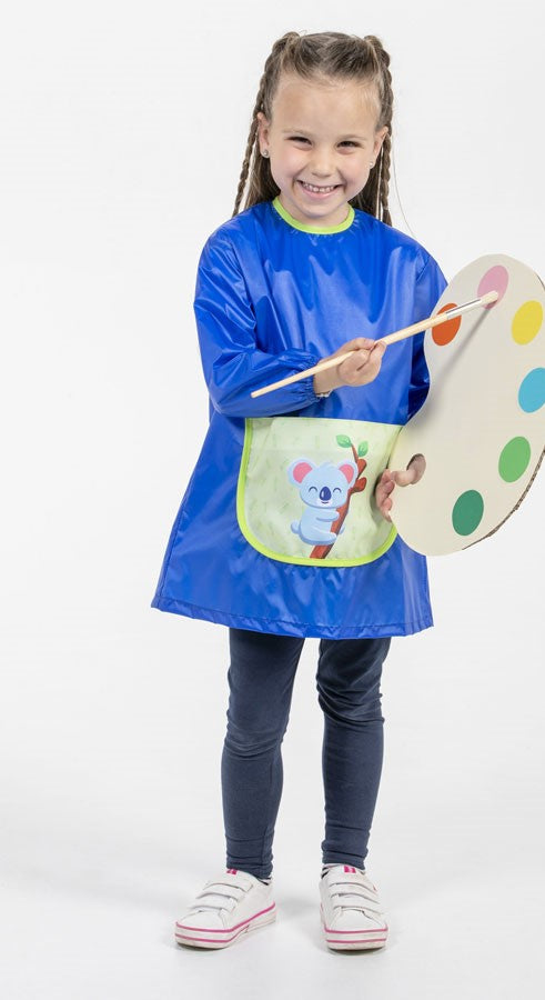 Bata escolar de plástico azul ideal para refeitórios e oficinas de artesanato. Mangas compridas e punhos de elástico. Fácil de limpar. Contraste de pistache no bolso e na gola com estampa de girafa. Aperta atrás com velcro. Alça de pescoço para pendurar. Dimensionamento: de T/1 a T/8