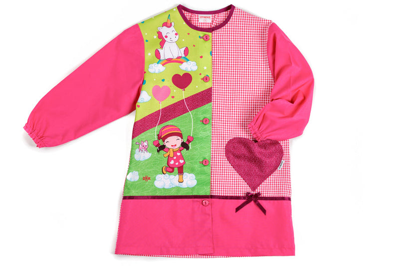 Bibe infantil para menina de manga comprida. punhos elásticos Combinação de tecidos quadrados e lisos em fúcsia. Impressão atraente em tons de verde em um lado. Bolso em forma de coração. Detalhe cardeal brilhante com laço. Fita de pescoço para pendurar.