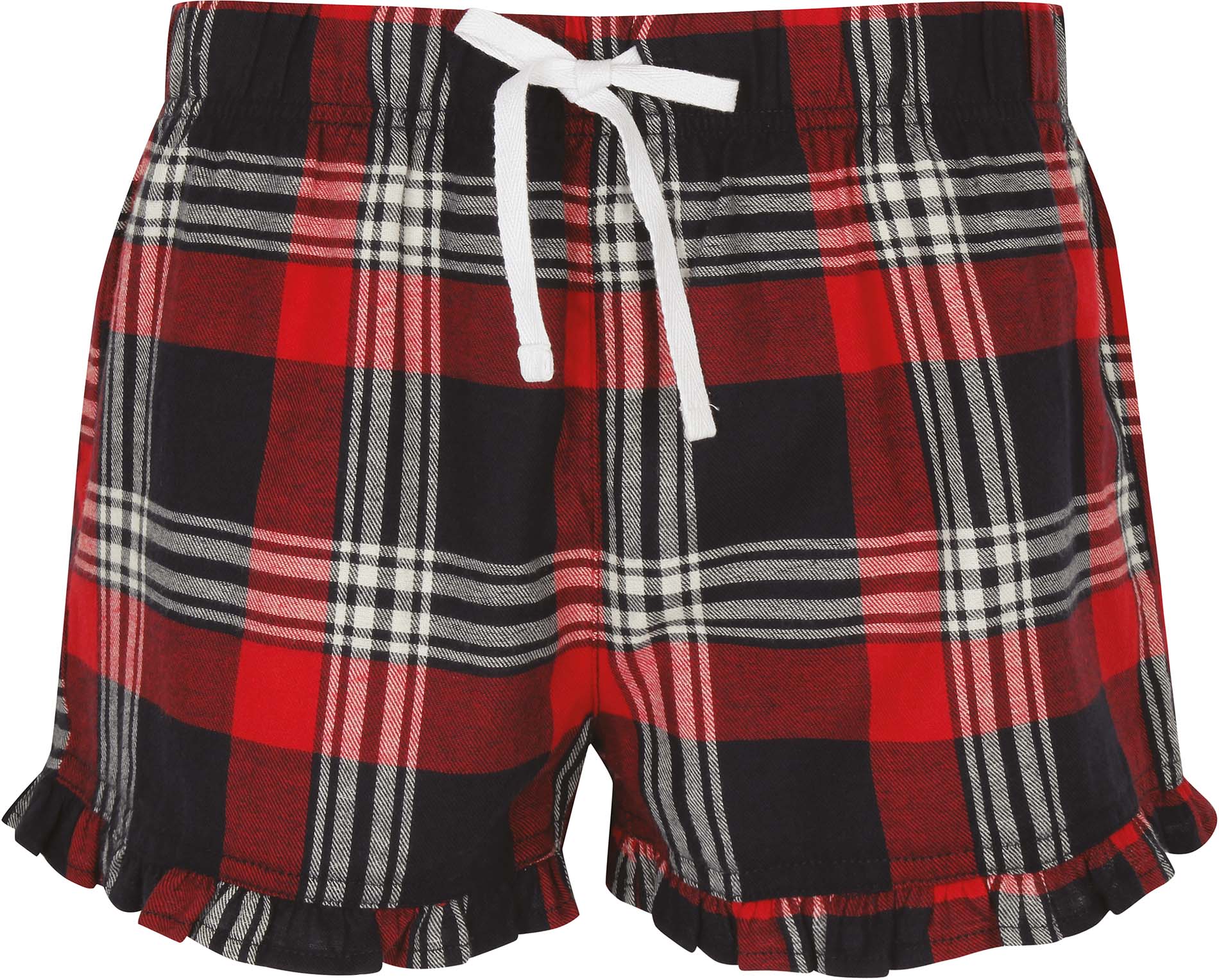 Flanela 100% algodão. Calções com estampa aos quadrados com folho. Cintura elástica com cordão decorativo. Etiqueta amovível. Gramagem 115 Dimensão