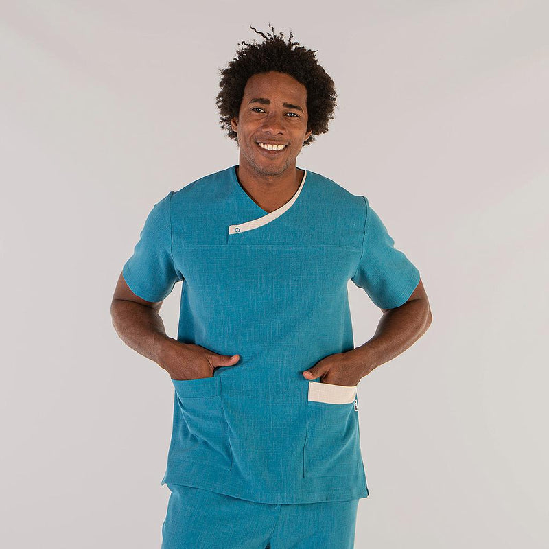 Jaqueta masculina de manga curta com decote em V, encaixe frontal e dois bolsos frontais. Peça folgada, com dardos nas costas. Fabricado em X.LINEN de 65% Poliéster - 30% Viscose - 5% Elastano, um novo tecido elástico com aspeto de linho, respirável e com toque macio. Para escolher em verde água ou bege, combinados no pescoço e na boca do bolso. Ideal como uniforme para enfermeiras, médicos e outros profissionais de saúde em hospitais, clínicas e centros médicos, farmácias ou comércio.