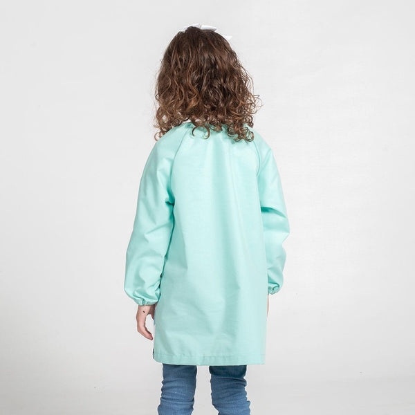 Bibe de manga comprida e punho com elástico, disponível em duas cores. Um bolso no lado direito.