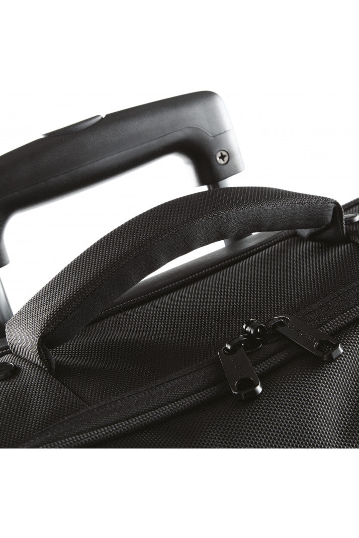 Poliéster 1680D. tamanho ideal para cabine. compatível com os computadores portáveis até 15.6 1D. pega tubular dupla bloqueável e retráctil. bolso frontal com organizador. rodas integradas de alta resistência. proteção com base sólida. compartimento principal com fecho com opção de utilização de cadeado. compartimento acolchoado para computador ... Gramagem 413 Dimensão 35 x 55 x 20 cm