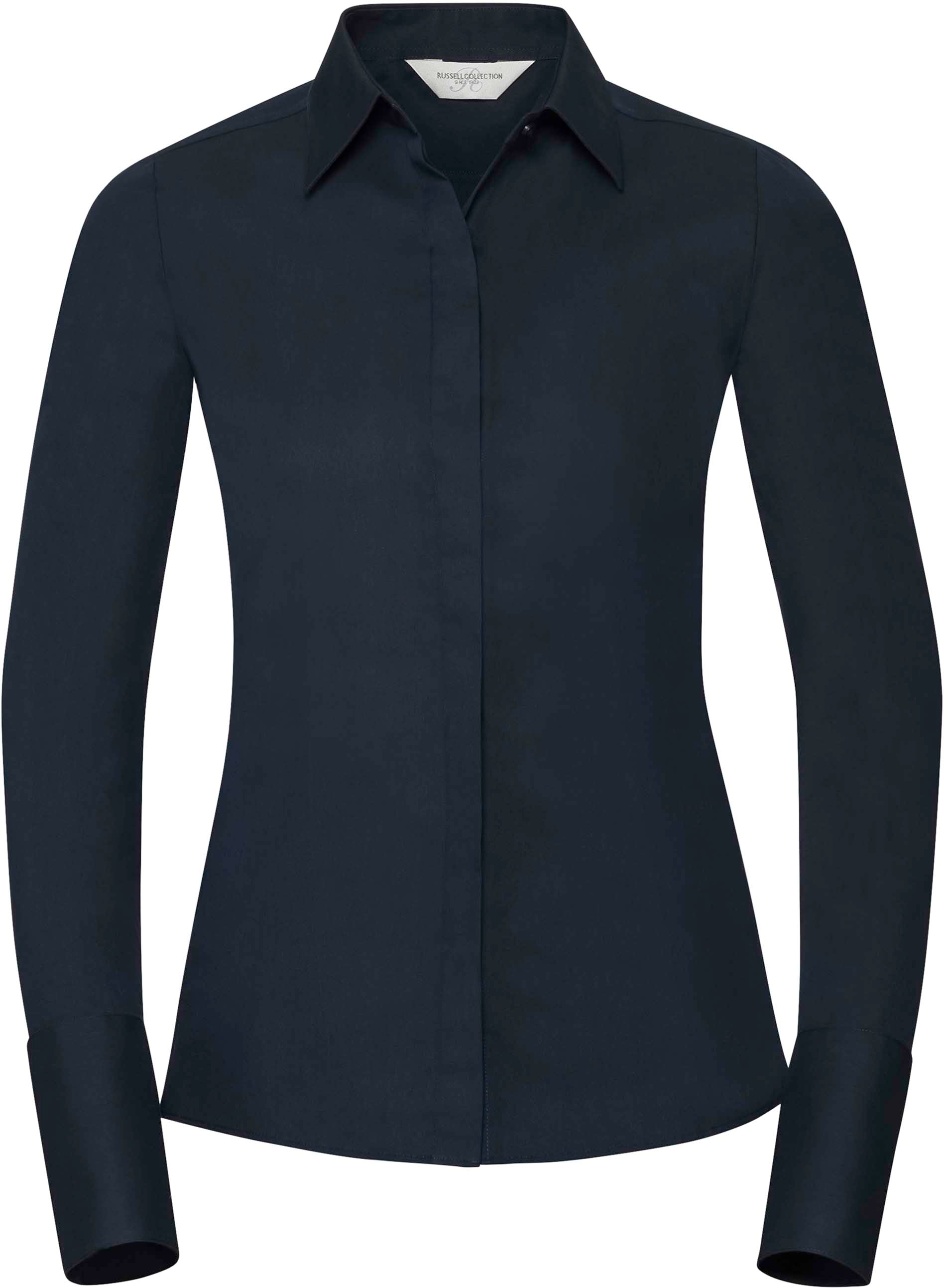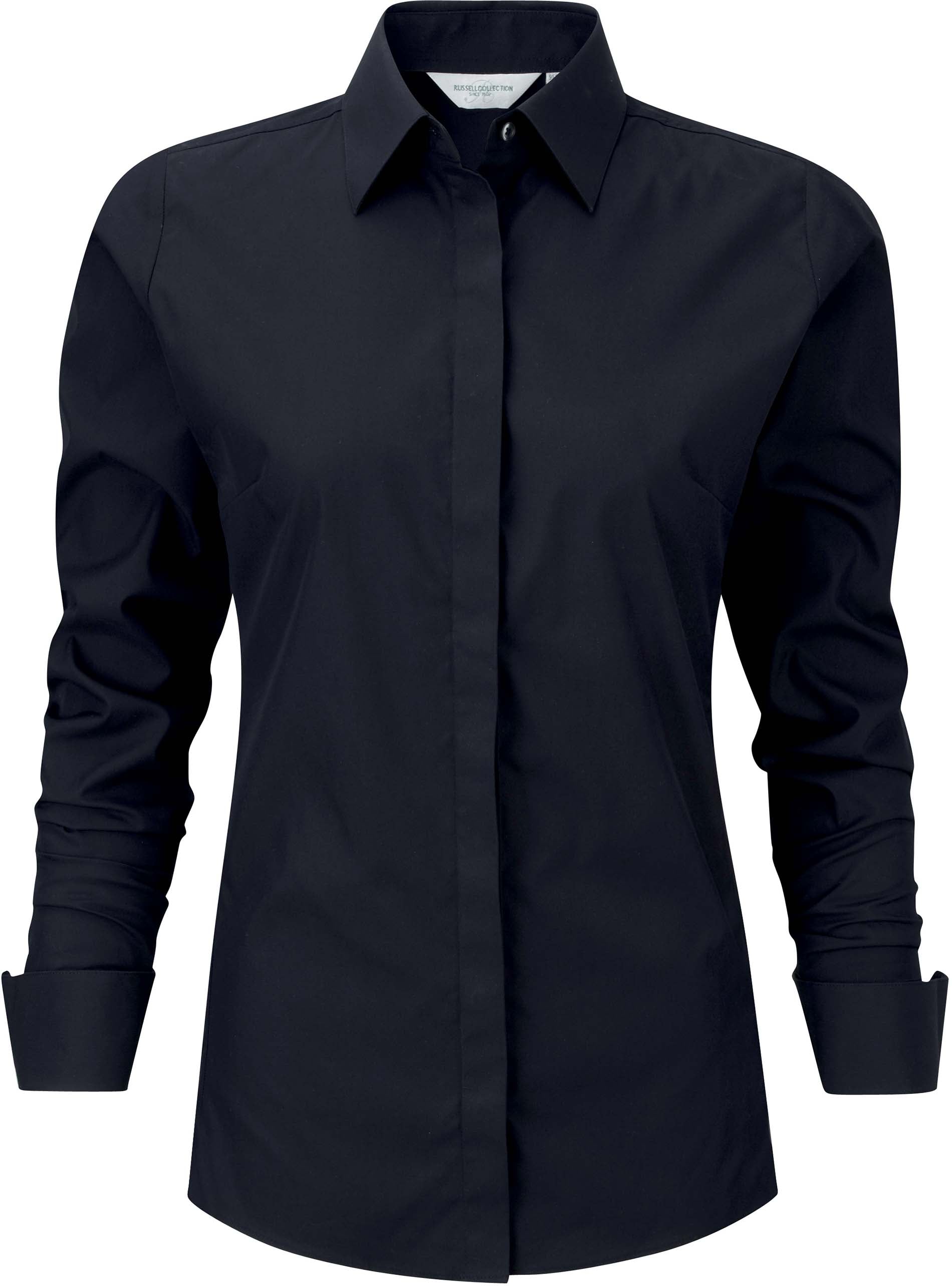 75% algodão/25% elastomultiéster (fibra de Lycra® T400). Esta nova fibra oferece conforto. elasticidade. durabilidade e melhor evacuação da humidade. Colarinho moderno. Carcela escondida. Sem costuras laterais. Pinças nas costas. Mangas Punhos fashion. Corte cintado. Gramagem 125/130 Dimensão