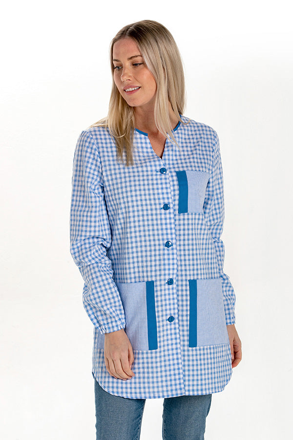 Bata educadora de manga comprida com gola redonda. O tecido é bem macio com quadrados e possui aba contrastante como detalhe nos bolsos. Possui três bolsos, dois inferiores e um superior. Os punhos são de elástico. Aperta com botões na frente.