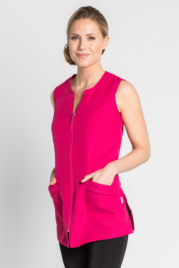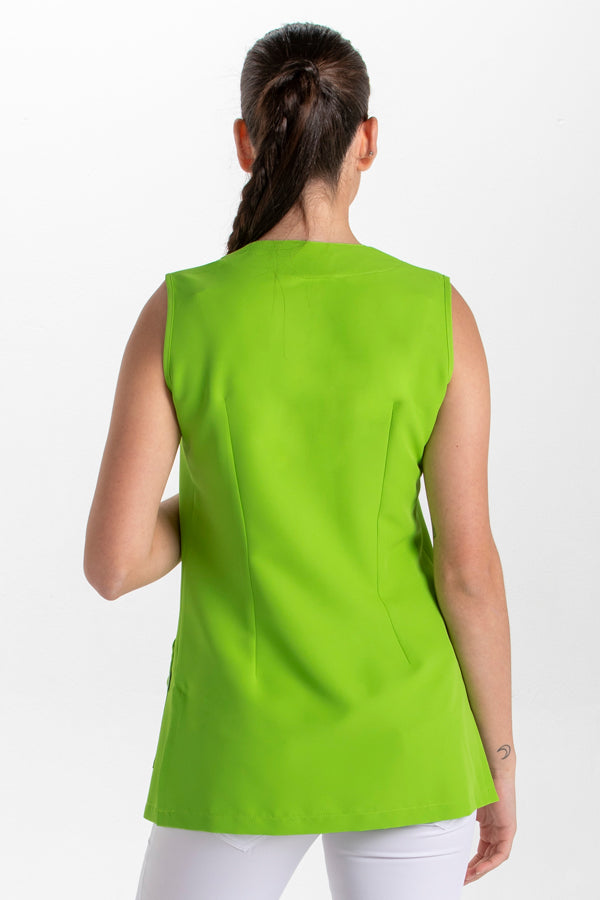 Túnica para comércio e estética, sem mangas. Gola redonda e bico. Com 2 bolsos frontais inferiores. Zíper de lágrima central. Cor branca. Comprimento de 73 cm. Túnica de baixo custo. Dimensionamento: SP - P - M - G - SG - SSG - XG.