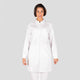 Bata feminina aberta, de mangas compridas com punhos abotoados, decote funil e fecho de botões frontal visível. Modelo ajustado com costuras na frente e costas e cinto nas costas. Possui um bolso no lado esquerdo do peito e dois bolsos na cintura. Disponível em branco. Ideal para uniformes de hospital, clínica, centro médico, farmácia, laboratório e demais profissionais de saúde, limpeza ou comércio.