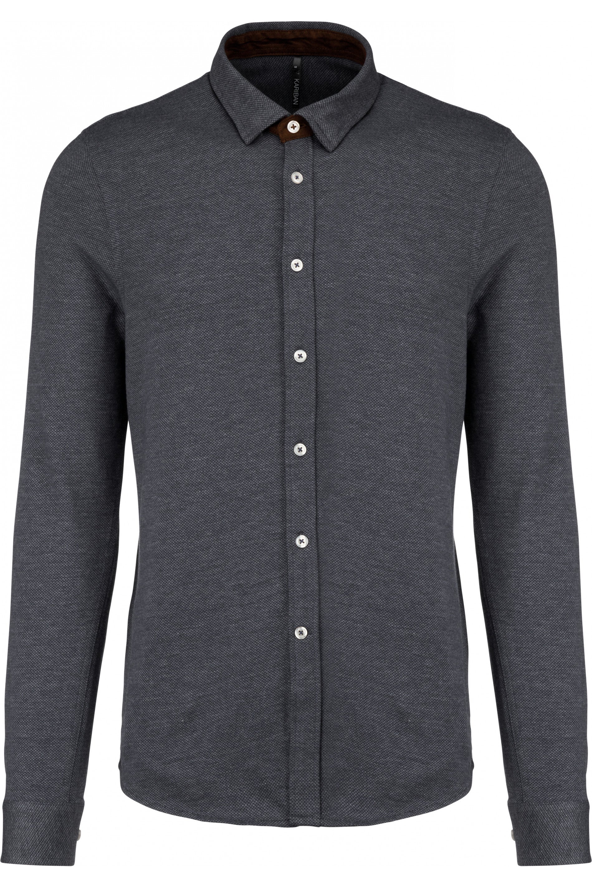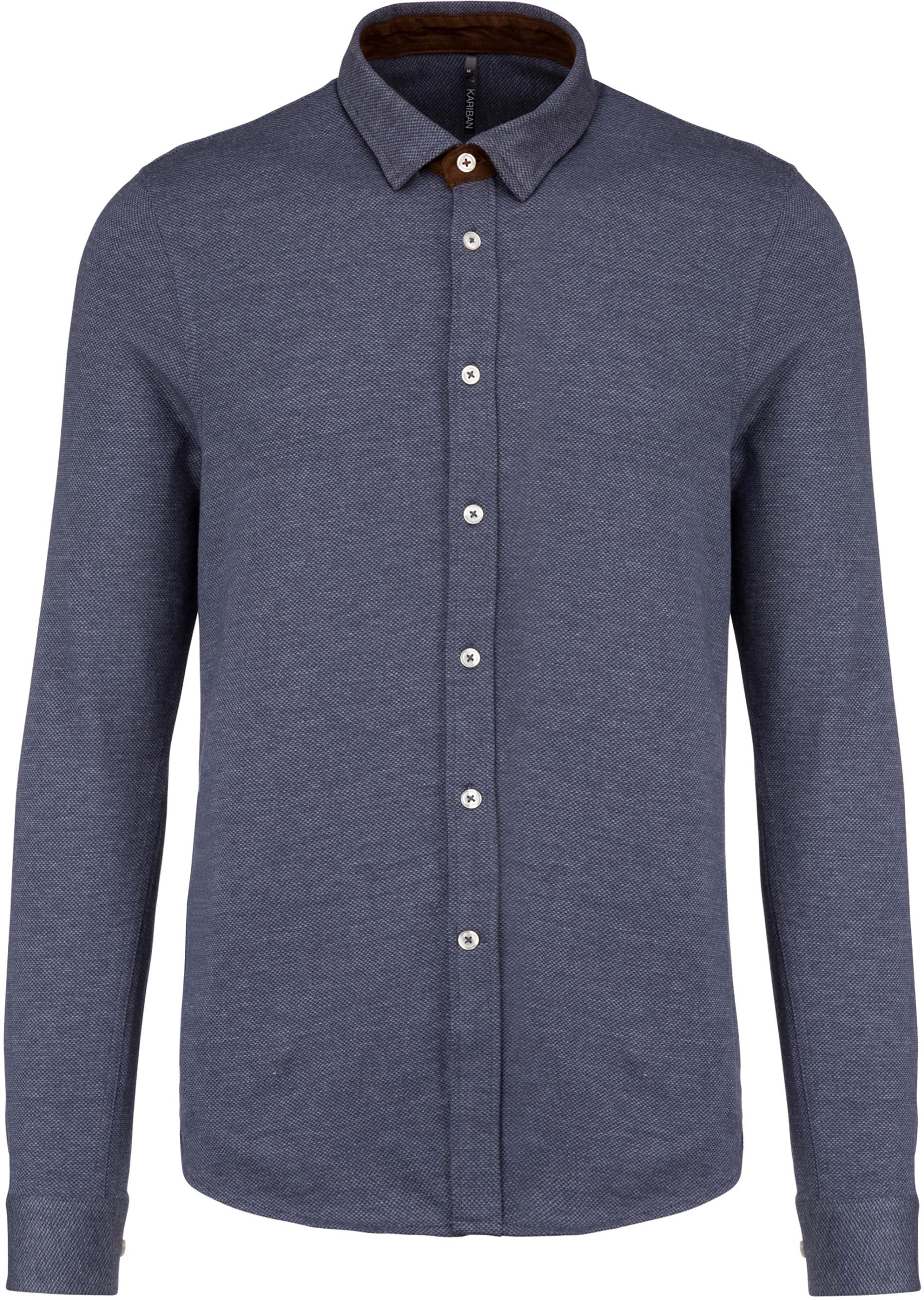 68% algodão / 32% poliéster. Malha jacquard. Base do colarinho de camurça em contraste. Look moderno. Material confortável e suave. Carcela clássica com botões imitação de pérola. Punhos reguláveis com botões imitação de pérola. Bainha arredondada. Gramagem 165 Dimensão
